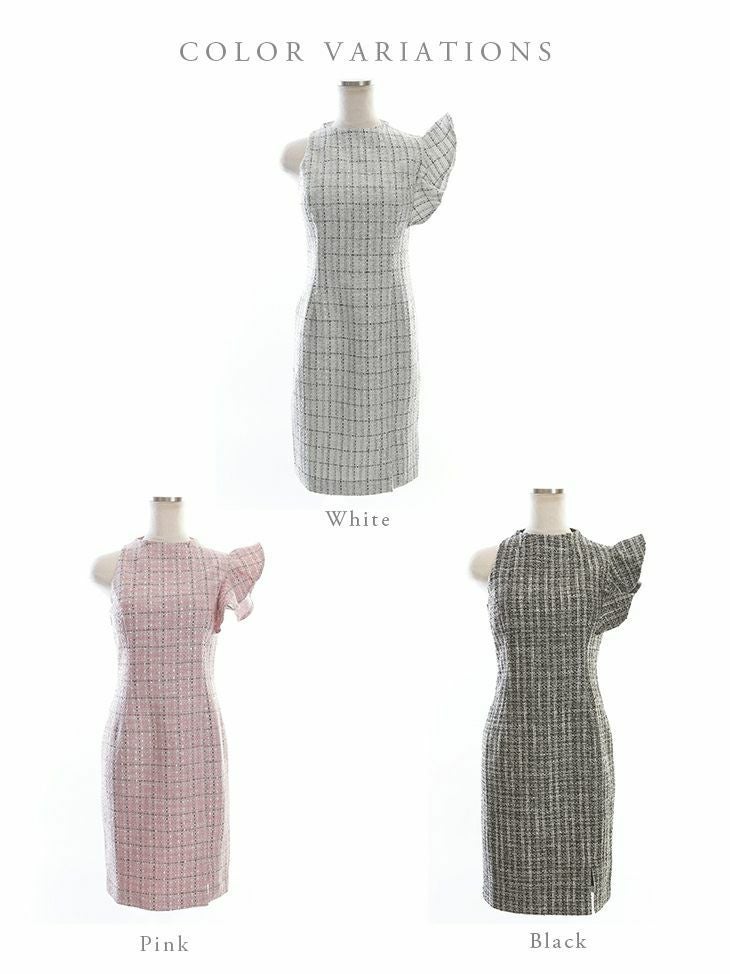 3. [DEA.byROBEdeFLEURS/ディアバイローブドフルール] 高級チェック柄ツイード×アシンメトリーノースリーブタイトミニワンピースドレス