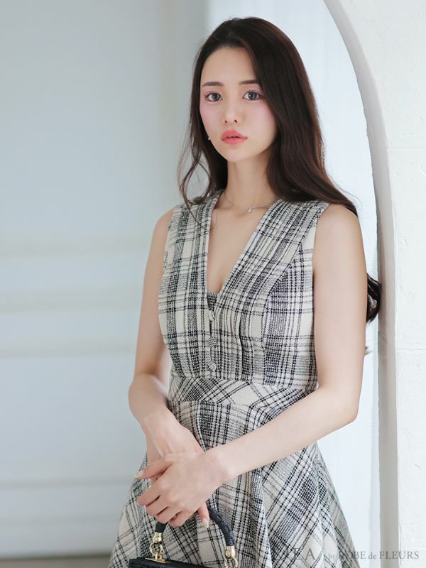 5. [DEA.byROBEdeFLEURS/ディアバイローブドフルール] 高級ノースリーブVネックチェック柄ツイードフレア膝丈ワンピースドレス