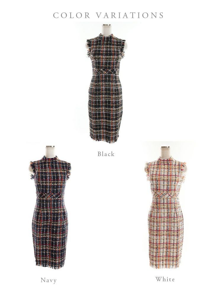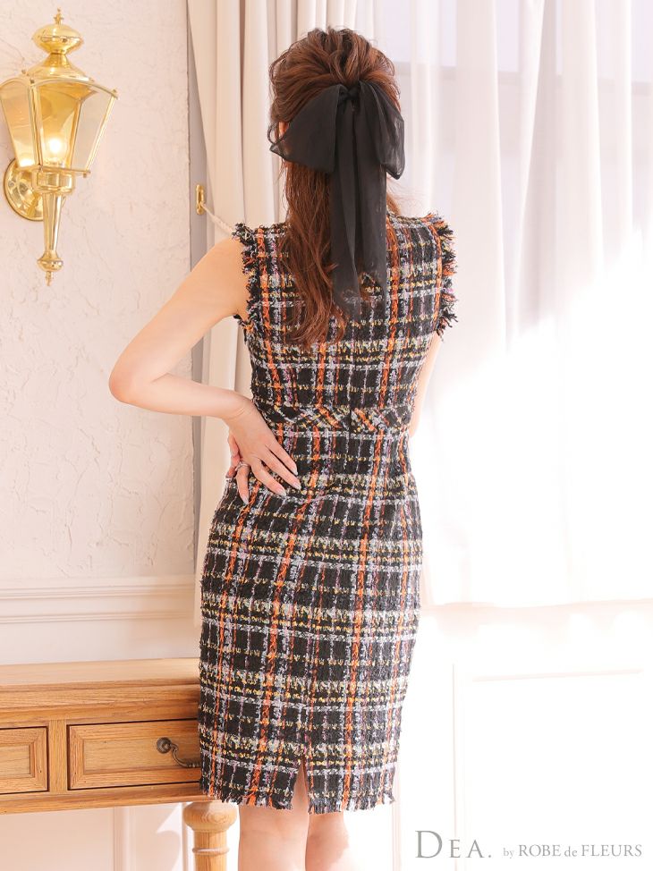 ツイード×チェックで周囲と差をつける☆ [DEA.byROBEdeFLEURS/ディアバイローブドフルール] 高級ノースリーブチェック柄ツイードワンピースフリル膝丈ドレス