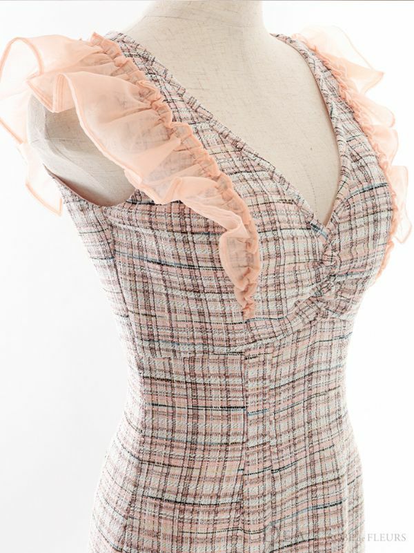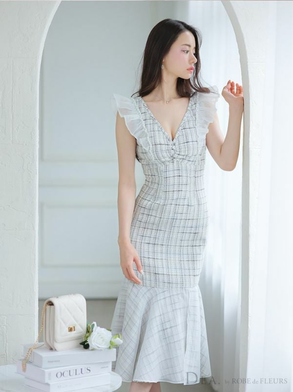 4. [DEA.byROBEdeFLEURS/ディアバイローブドフルール] 高級フリル袖チェック柄ツイードマーメイドノースリーブタイト膝丈ワンピースドレス