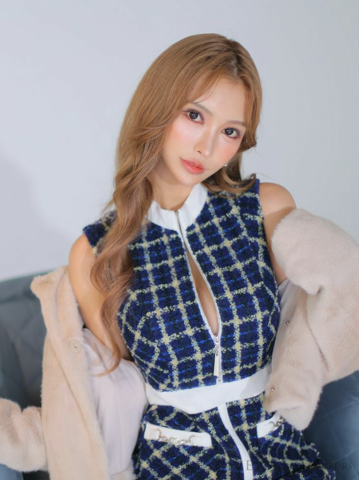 4. [DEA.byROBEdeFLEURS/ディアバイローブドフルール] 高級チェック柄ツイードフロントジップノースリーブタイトミニドレス