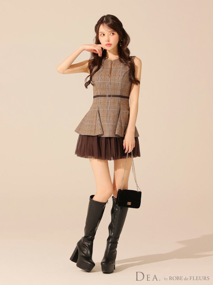 ボリューミーなチュールが可愛い♡ [DEA.byROBEdeFLEURS/ディアバイローブドフルール] 高級 ノースリーブ チェック柄 ジップ ウエストベルトデザイン チュール フレアミニドレス