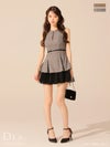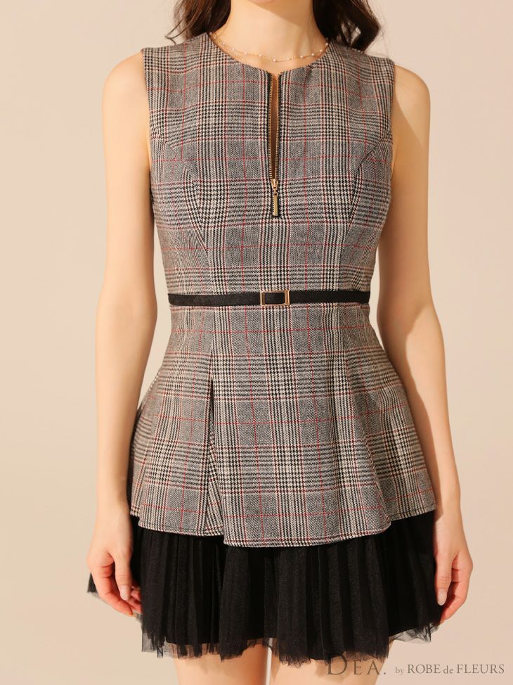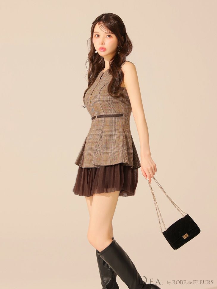 上品な可愛さを纏う1着♡ [DEA.byROBEdeFLEURS/ディアバイローブドフルール] 高級 ノースリーブ チェック柄 ジップ ウエストベルトデザイン チュール フレアミニドレス