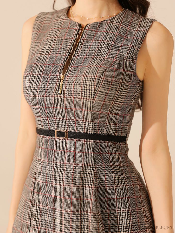 5. [DEA.byROBEdeFLEURS/ディアバイローブドフルール] 高級 ノースリーブ チェック柄 ジップ ウエストベルトデザイン チュール フレアミニドレス