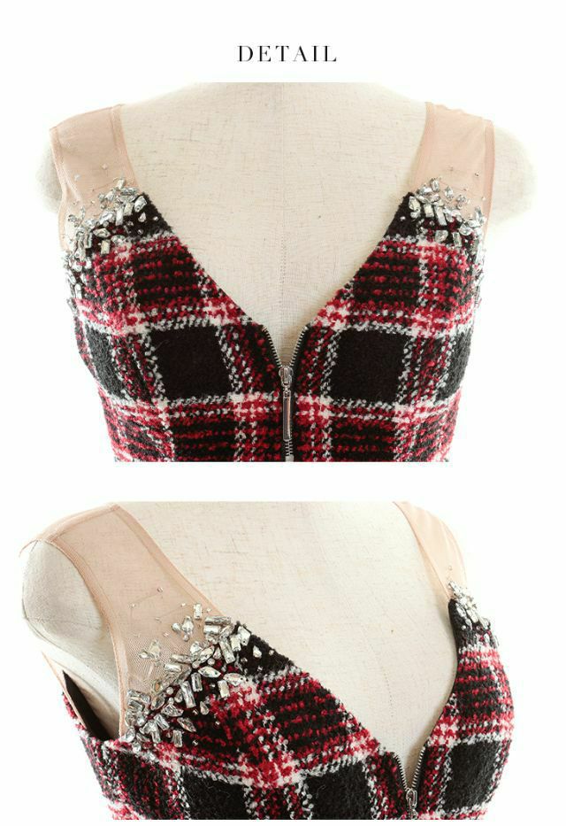 5. SALE [ROBEdeFLEURSGlossy/ローブドフルールグロッシー] 高級チェック柄ノースリーブチュールビジューフロントジップツイードタイトミニドレス