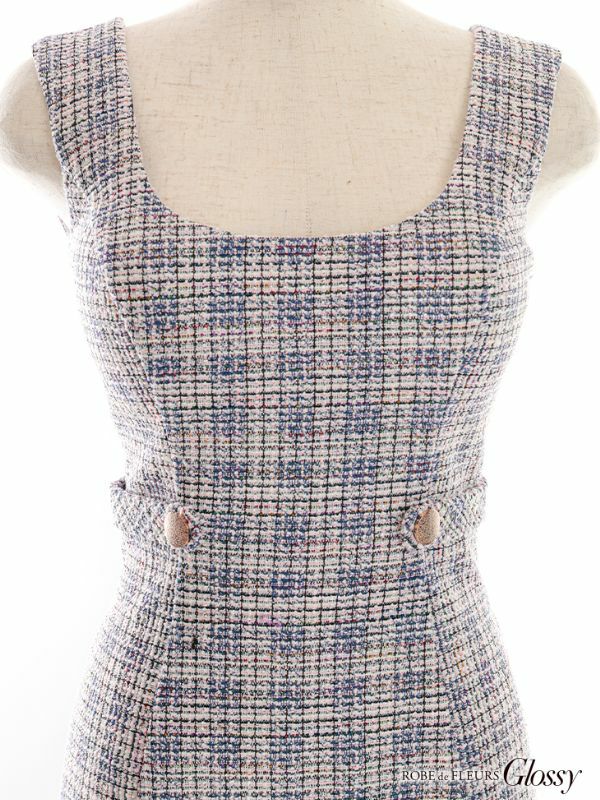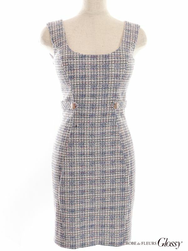 4. [ROBEdeFLEURSGlossy/ローブドフルールグロッシー] 高級チェック柄ノースリーブシンプルツイードウエストマークタイトミニワンピースドレス