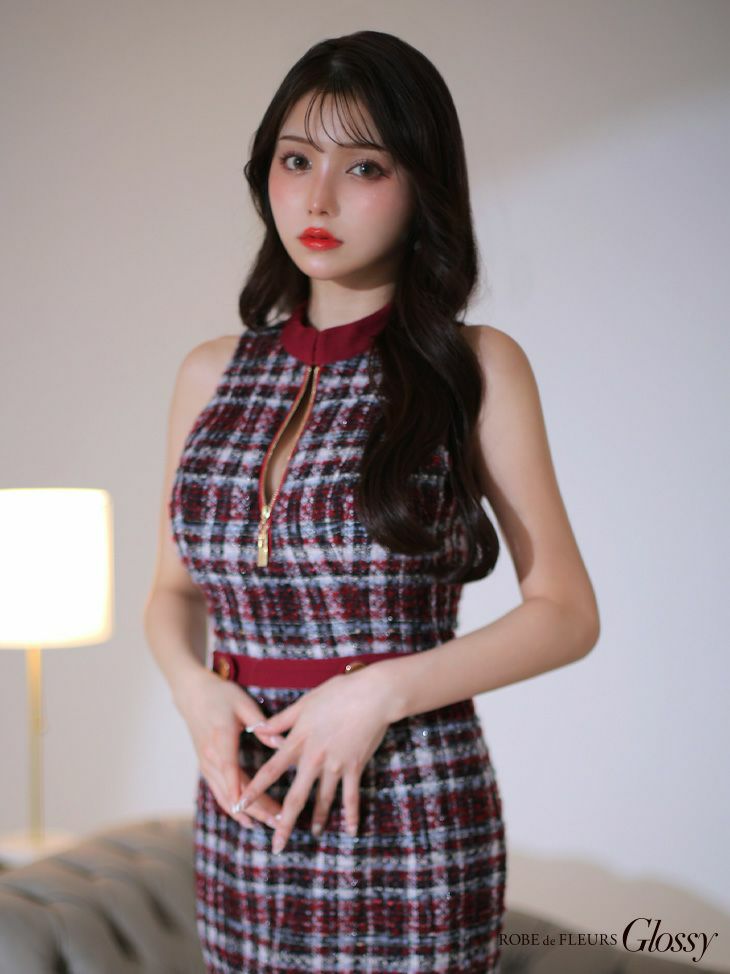 上品とセクシーのいいとこ取り☆ [ROBEdeFLEURSGlossy/ローブドフルールグロッシー] 高級フロントジッパー×チェック柄ノースリーブツイードタイトミニドレス