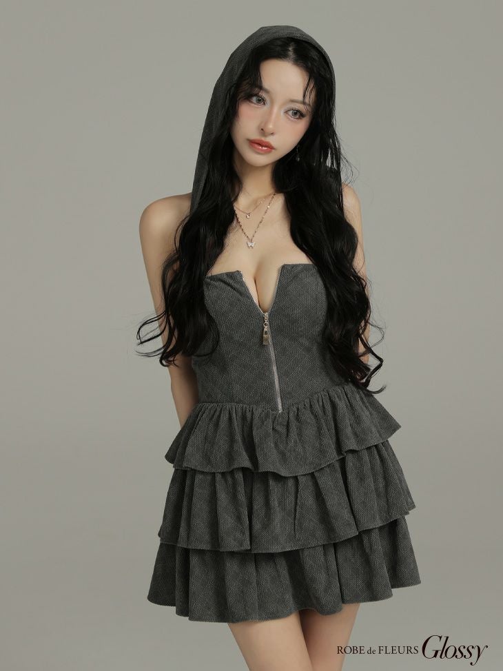 フード付きドレスで視線独占♡ [ROBEdeFLEURSGlossy/ローブドフルールグロッシー] 高級 ブランド Aラインミニドレス ノースリーブ 谷間 チェック柄 ジップ 2way ベアデザイン フーディー ティアードフリル