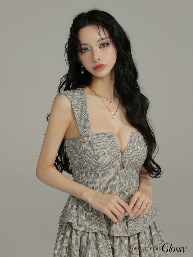 4. [ROBEdeFLEURSGlossy/ローブドフルールグロッシー] 高級 ブランド Aラインミニドレス ノースリーブ 谷間 チェック柄 ジップ 2way ベアデザイン フーディー ティアードフリル