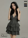 フードを外してベアでも着られる♡ [ROBEdeFLEURSGlossy/ローブドフルールグロッシー] 高級 ブランド Aラインミニドレス ノースリーブ 谷間 チェック柄 ジップ 2way ベアデザイン フーディー ティアードフリル