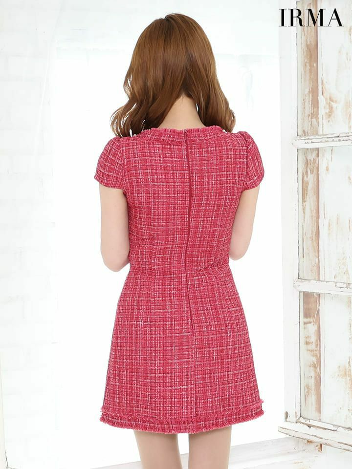 5. [IRMA/イルマ] 高級 半袖 バストカット ツイード チェック柄 サイドベルト付き 谷間魅せ フレアミニドレス