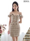 クラシカルなトレンド感溢れる☆ [IRMA/イルマ] 高級チェック柄ツイード肩出し 二の腕カバージップウエストカットタイトミニドレス