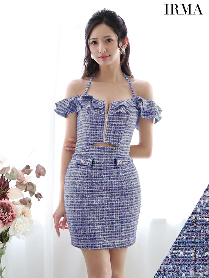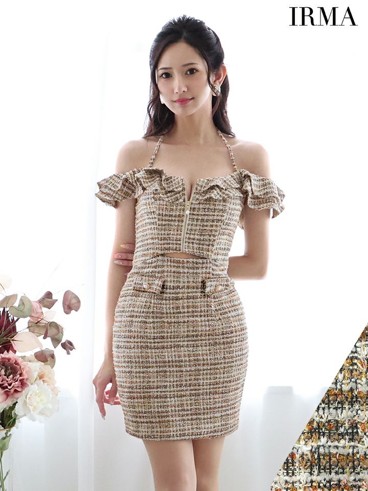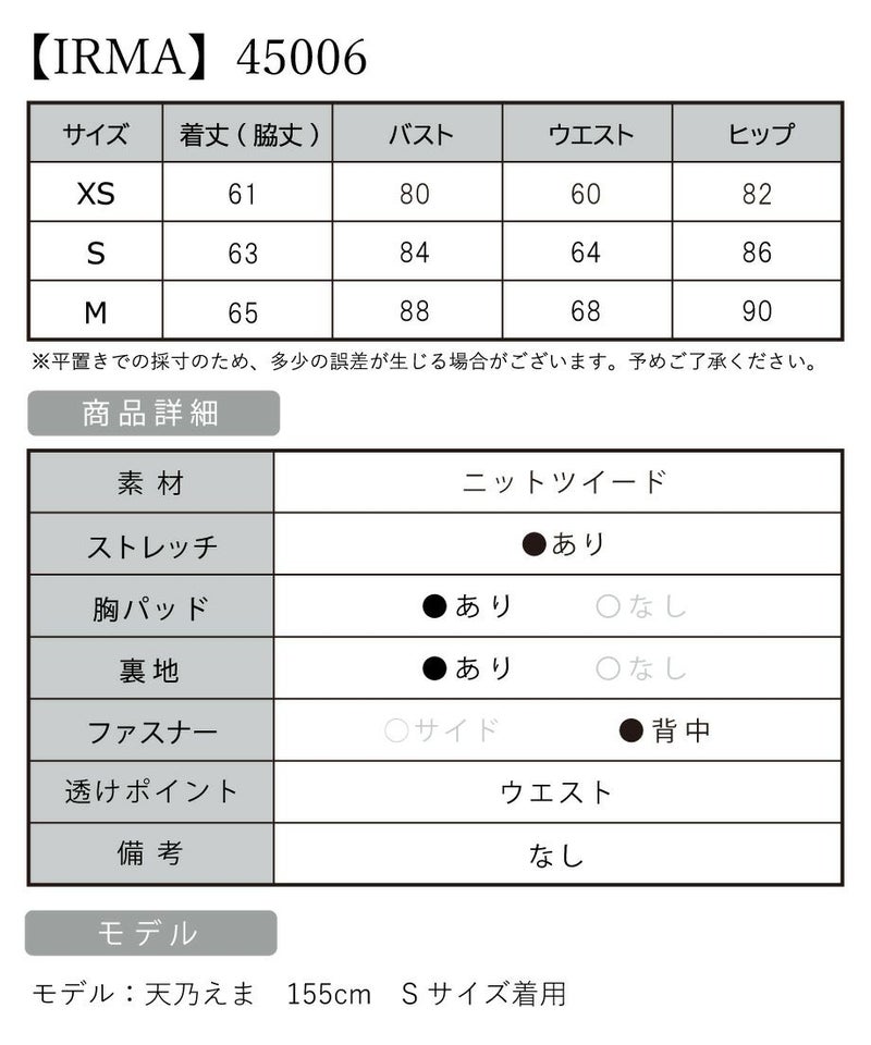 6. [IRMA/イルマ] 高級チェック柄ツイード肩出し 二の腕カバージップウエストカットタイトミニドレス