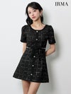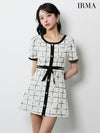 3. [IRMA/イルマ] 高級 ブランド ワンピース Aラインミニドレス 半袖 ウエストリボン付き チェック柄 ツイード 大人