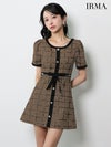 クラシカルな可愛さ漂う♡ [IRMA/イルマ] 高級 ブランド ワンピース Aラインミニドレス 半袖 ウエストリボン付き チェック柄 ツイード 大人