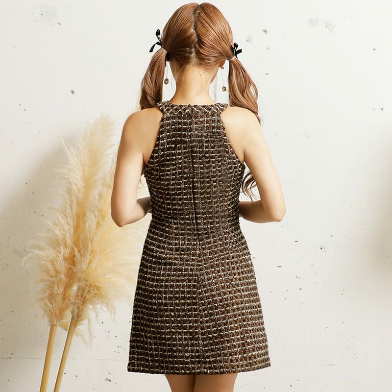 3. SALE [PURESS/ピュアレス] 高級ウエストカットバストツイードホルターネックチェック柄フレアミニドレス
