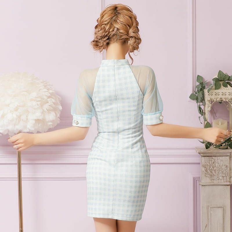 4. [PURESS/ピュアレス] 高級 袖あり シアースリーブ バストカット フロントボタン チェック柄 谷間魅せ タイトミニドレス