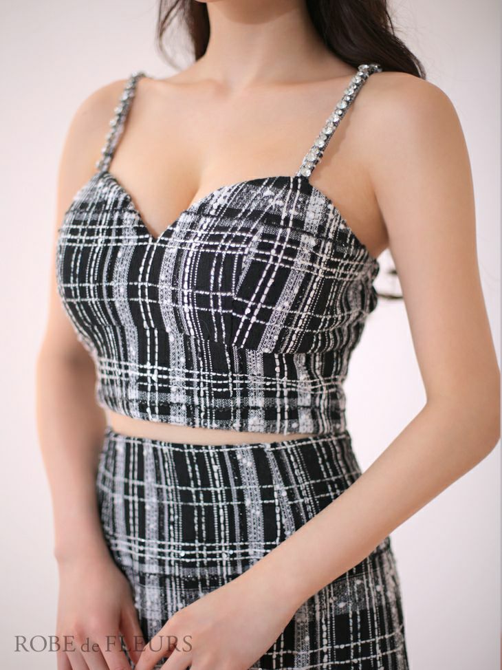 チェックツイードとオーガンジーがフェミニン☆ SALE [ROBEdeFLEURS/ローブドフルール] 高級ラメチェック柄ツイード×オーガンジー セットアップロングドレス