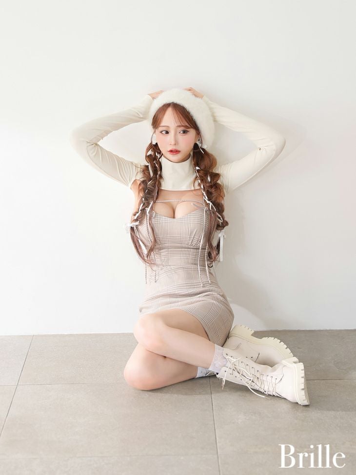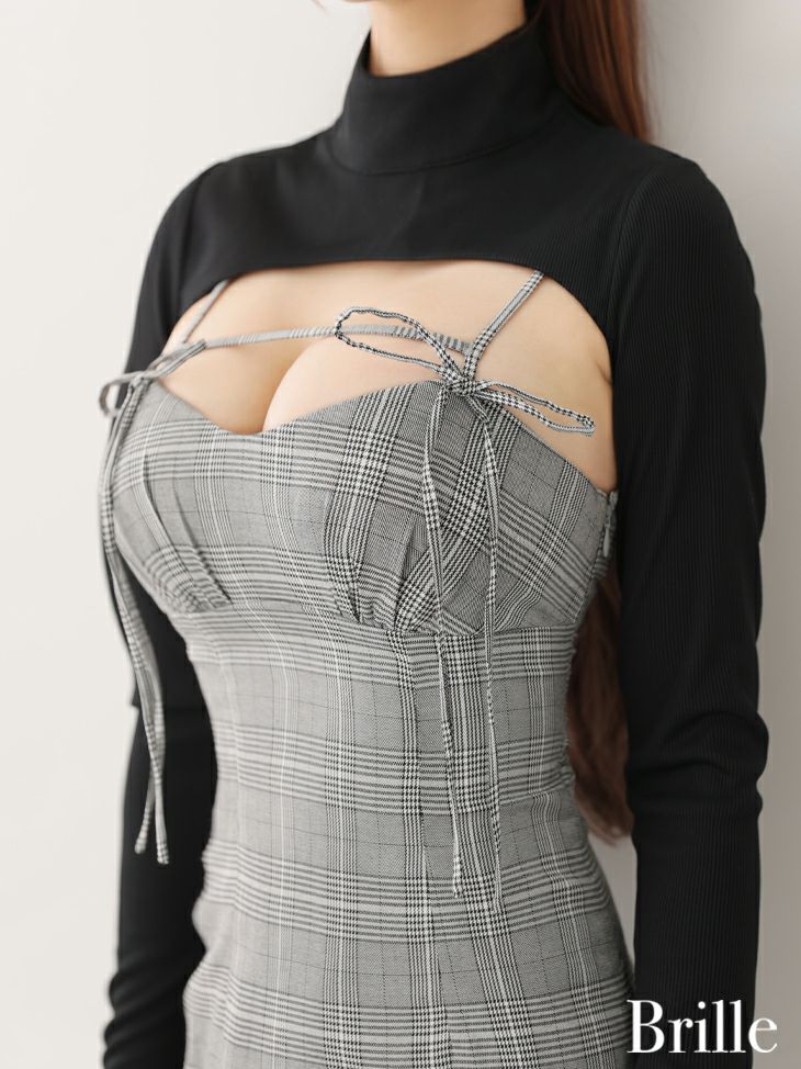 れみちゃんプロデュース☆ [Brille/ブリエ] 高級リブニットボレロ付きチェック柄バックカットアウトリボンキャミソールタイトミニドレス