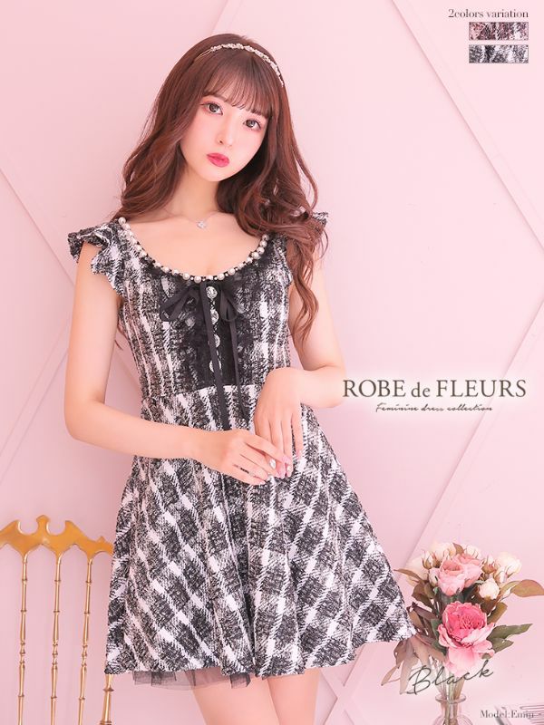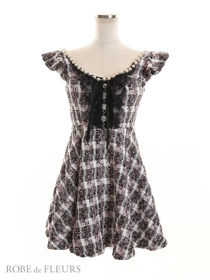 チェック柄×リボンでガーリーな可愛さ炸裂☆ [ROBEdeFLEURS/ローブドフルール] 高級袖フリルツイードチェック柄ガーリーリボンフレアミニドレス
