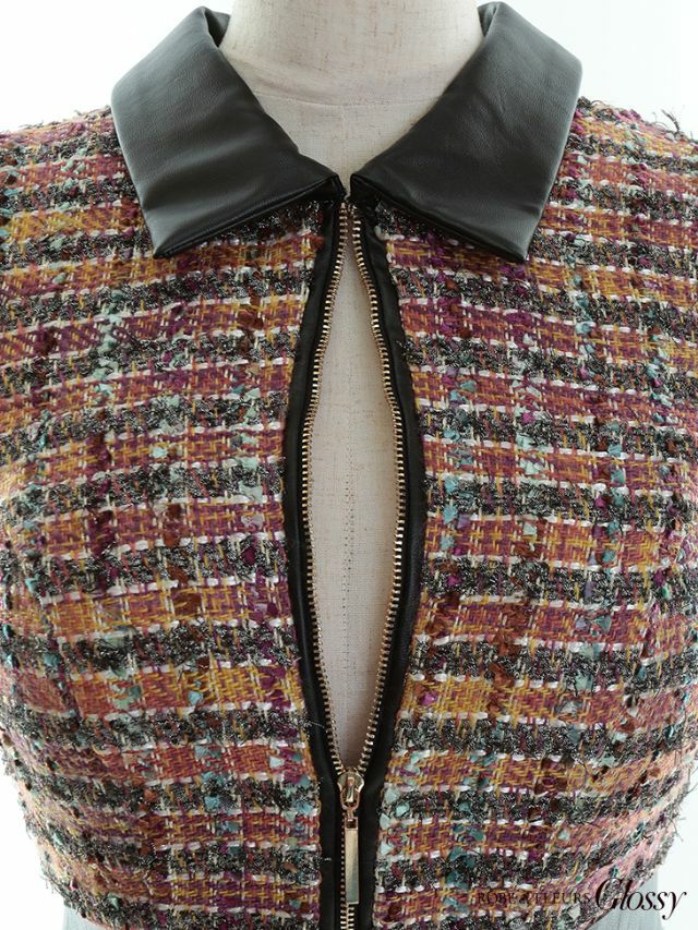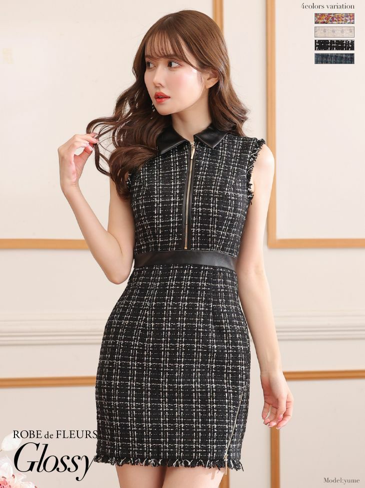 他の画像を見る 襟付き×ツイードで上品見え☆ [ROBEdeFLEURSGlossy/ローブドフルールグロッシー] 高級 チェック柄 レザー風 襟付き フロントジップ ツイード ノースリーブ ファスナースリット タイトミニドレス ¥ 29,480 税込 在庫切れ お気に入りに追加