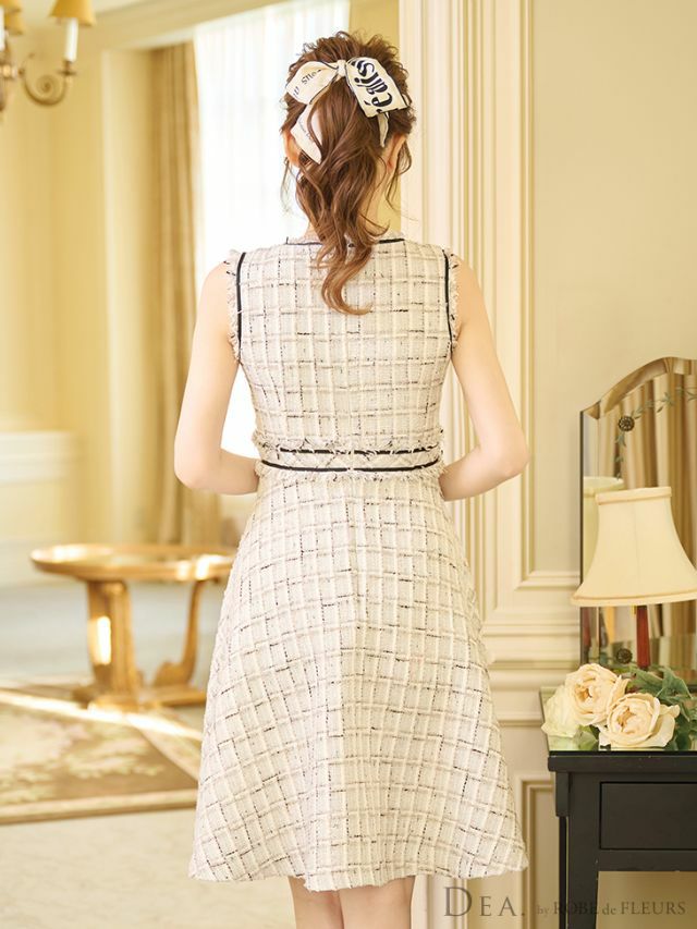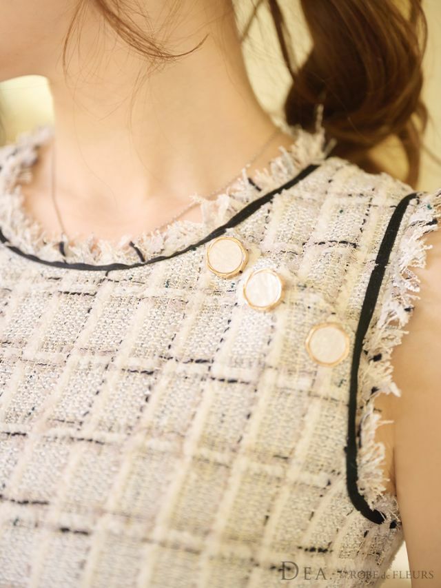 他の画像を見る ネックラインのビジューが印象的☆ [DEA.byROBEdeFLEURS/ディアバイローブドフルール] 高級ラメツイードチェック柄ボタンセットアップノースリーブタイトミニワンピースドレス ¥ 28,380 税込 在庫切れ お気に入りに追加