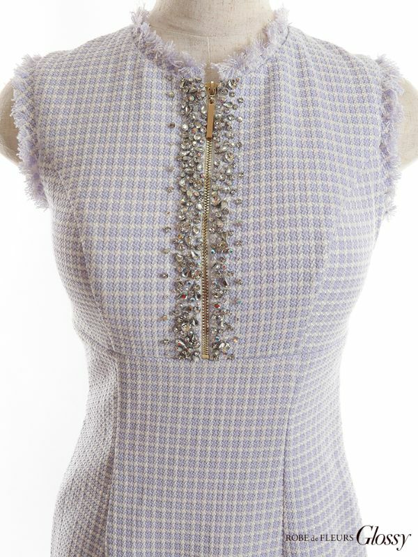 他の画像を見る ツイード×ビジューで高級感漂う☆ [ROBEdeFLEURSGlossy/ローブドフルールグロッシー] 高級チェック柄フリンジツイードバストフロントジップバックリボンクロスビジューノースリーブタイトミニドレス ¥ 28,380 税込 在庫切れ お気に入りに追加