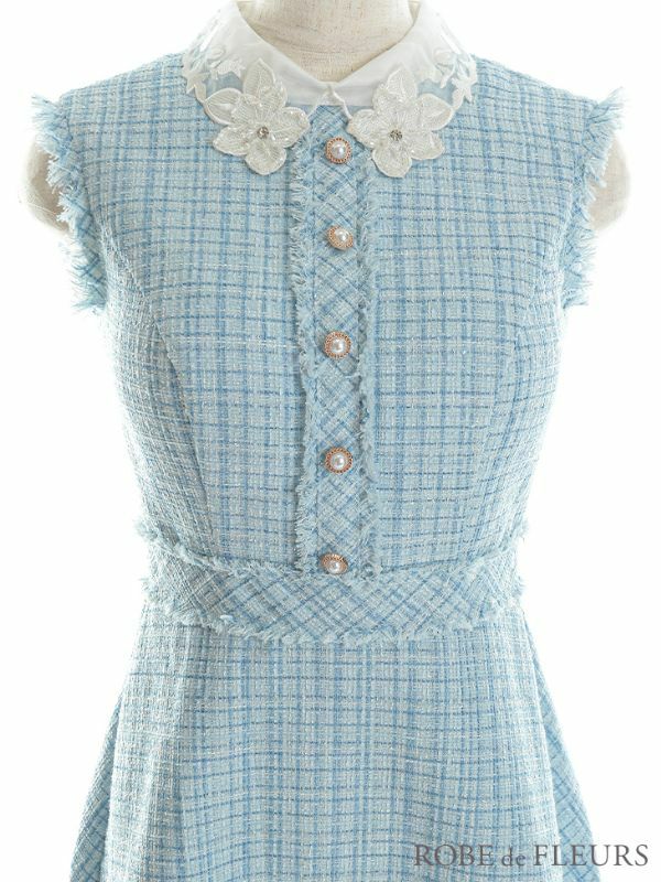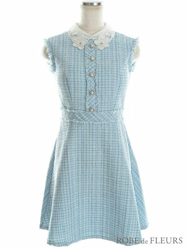 他の画像を見る ガーリーな可愛さを詰め込んだツイードドレス☆ [ROBEdeFLEURS/ローブドフルール] 高級 チェック柄 ツイード フラワーレース 襟付き パールボタン ノースリーブ ワンピース フレアミニドレス ¥ 27,280 税込 在庫切れ お気に入りに追加
