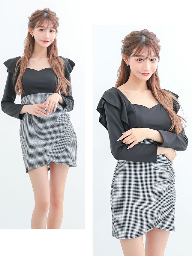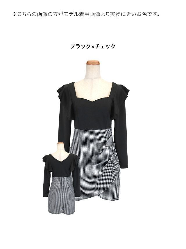 長袖フリルギンガムチェック柄ウエスト切替タイトミニドレスのカラバリ画像