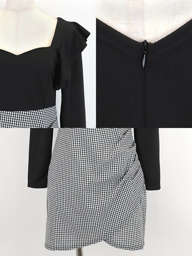 長袖フリルギンガムチェック柄ウエスト切替タイトミニドレスの詳細画像1