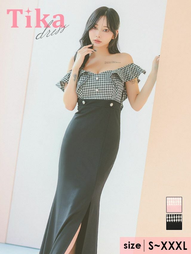 女性らしい美シルエットをメイク♪ ガーリーチェック柄2Wayオフショルダーフリル袖ウエストサイドバックル切り替えタイトロングドレス (Sサイズ~XXXLサイズ) (戦慄かなの/キャバドレス着用)