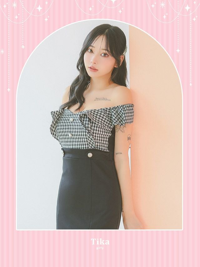 5. ガーリーチェック柄2Wayオフショルダーフリル袖ウエストサイドバックル切り替えタイトロングドレス (Sサイズ~XXXLサイズ) (戦慄かなの/キャバドレス着用)