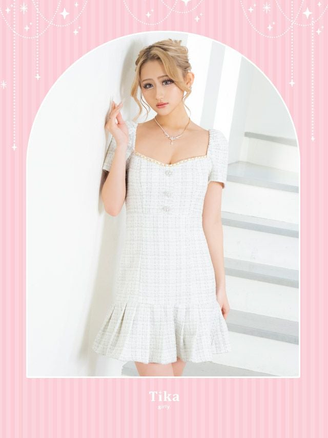 韓国っぽさ溢れるガーリーデザイン♪ [SALE] 半袖ネックチェーンフラワーボタンツイードチェック柄プリーツフレアミニドレス (Sサイズ~XLサイズ) (伊藤愛依海/キャバドレス着用)