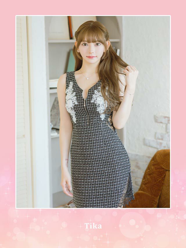 4. ノースリーブフラワー刺繍ビジューバストジップくびれレースツイードチェック柄タイトミニドレス (Sサイズ~XLサイズ) (黒崎みさ/キャバドレス着用)