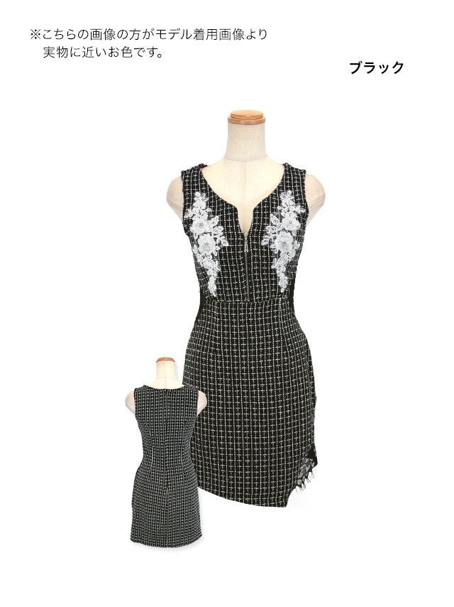 ノースリーブフラワー刺繍ビジューバストジップくびれレースツイードチェック柄タイトミニドレスのカラーバリエーション