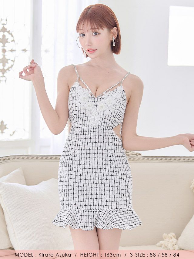 3. セクシー キャミソール ビジュー 刺繍 くびれ バストコード ツイード チェック柄 裾フリル 谷間魅せ タイトミニドレス (Sサイズ~Lサイズ) (浦西ひかる/キャバドレス着用)