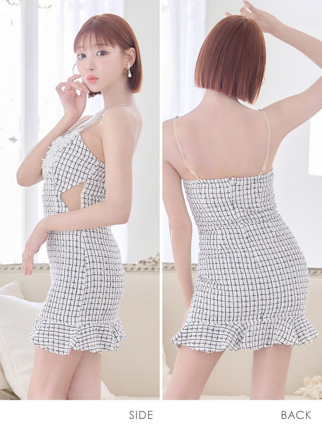 ストーン付きキャミソールコードバスト刺繍シアーくびれツイードチェック柄裾フリルタイトミニドレスのカラーバリエーション