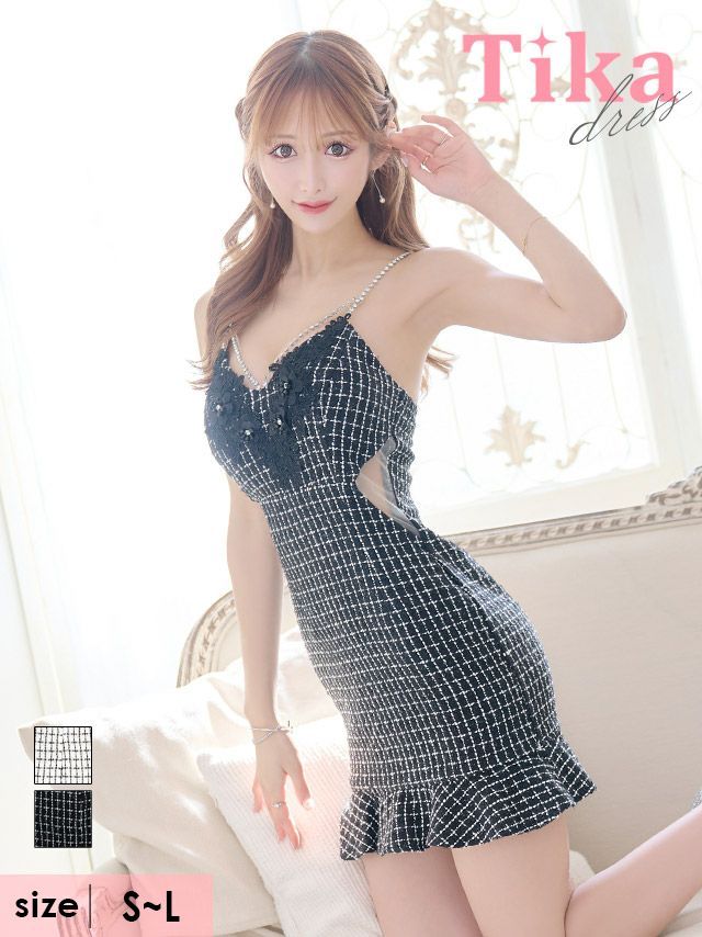 5. ストーン付き セクシー キャミソール コードバスト 刺繍シアー くびれ ツイード チェック柄 裾フリル タイトミニドレス (Sサイズ~Lサイズ) (明日花キララ/キャバドレス着用)