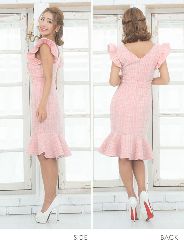 3. [SALE] Vネック ノースリーブ フリル袖 ツイード ガーリー チェック柄 マーメイド タイト膝丈ドレス (Sサイズ~XXLサイズ) (浦西ひかる/キャバドレス着用)