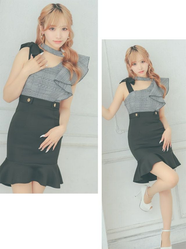 5. ワンショルダー風グレンチェック柄切り替えストレッチ裾フリルタイトミニテールドレス (Sサイズ~Lサイズ) (重川茉弥/キャバドレス着用)