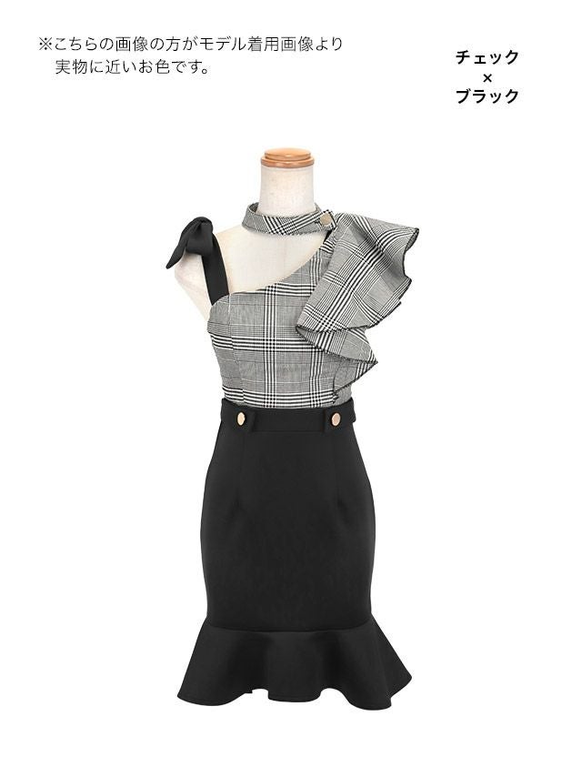 周囲と差をつけるお洒落ドレス♪ ワンショルダー風グレンチェック柄切り替えストレッチ裾フリルタイトミニテールドレス (Sサイズ~Lサイズ) (重川茉弥/キャバドレス着用)
