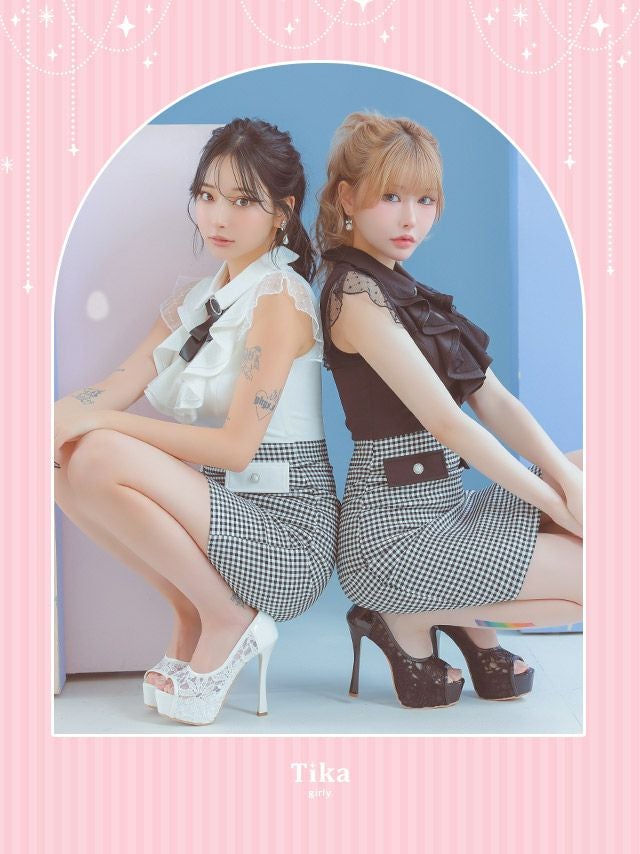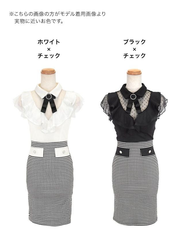 4. ネックリボン ブローチ付き 襟付き シアーノースリーブ 胸元フリル バストシースルー チェック柄 谷間魅せ タイトミニドレス (Sサイズ~Lサイズ) (PyunA./キャバドレス着用)