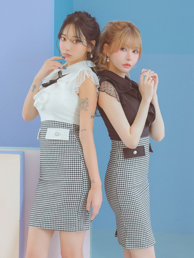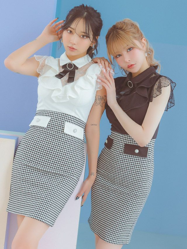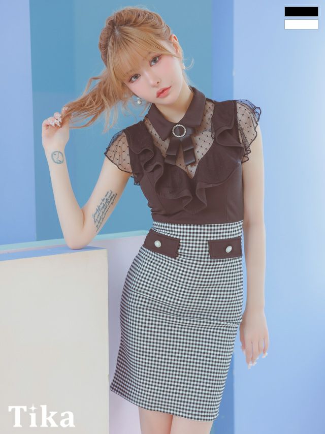 3. ネックリボン ブローチ付き 襟付き シアーノースリーブ 胸元フリル バストシースルー チェック柄 谷間魅せ タイトミニドレス (Sサイズ~Lサイズ) (PyunA./キャバドレス着用)