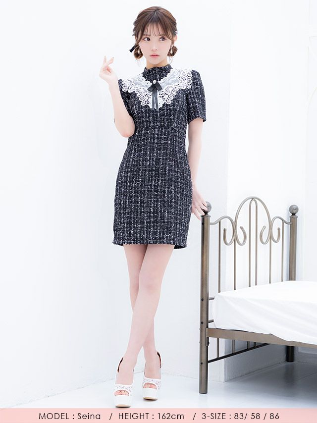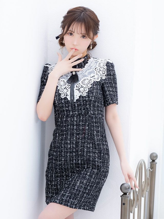 5. [SALE] ネックリボン フラワーレース 半袖 ツイード チェック柄 胸元カバー タイトミニドレス (Sサイズ~XXLサイズ) (聖菜/キャバドレス着用)