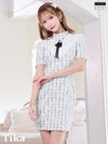 3. [SALE] ネックリボン フラワーレース 半袖 ツイード チェック柄 胸元カバー タイトミニドレス (Sサイズ~XXLサイズ) (聖菜/キャバドレス着用)