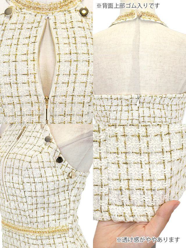 着るだけでサマになる♪ [SALE] ゴールドチェーンツイードチェック柄ホルターネックバストジップタイトミニドレス (Sサイズ~XLサイズ) (伊藤愛依海 若林萌々/キャバドレス着用)