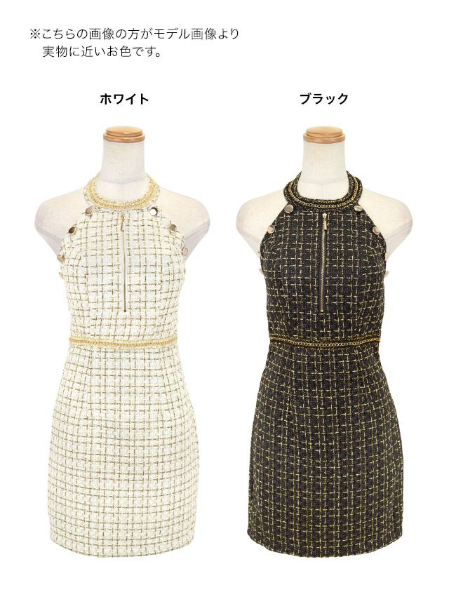 ホルターネックメタルボタンチェーンツイードチェック柄バストジップタイトミニドレスのカラーバリエーション