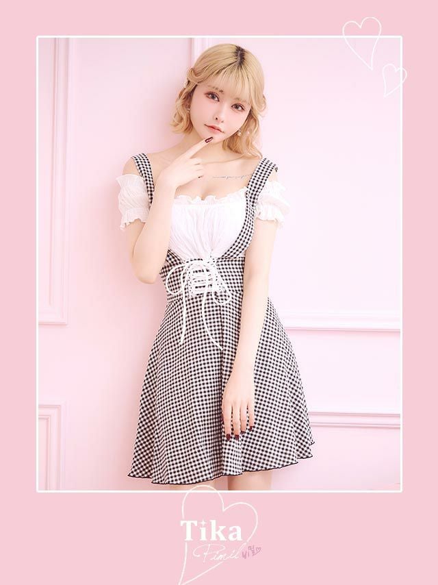 5. [韓国ドレス] シフォンオフショルダーサロペ風レースアップハイウエスト切替フレアチェック柄ミニドレス (Sサイズ~Lサイズ) (戦慄かなの/キャバドレス着用)