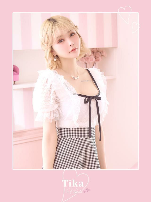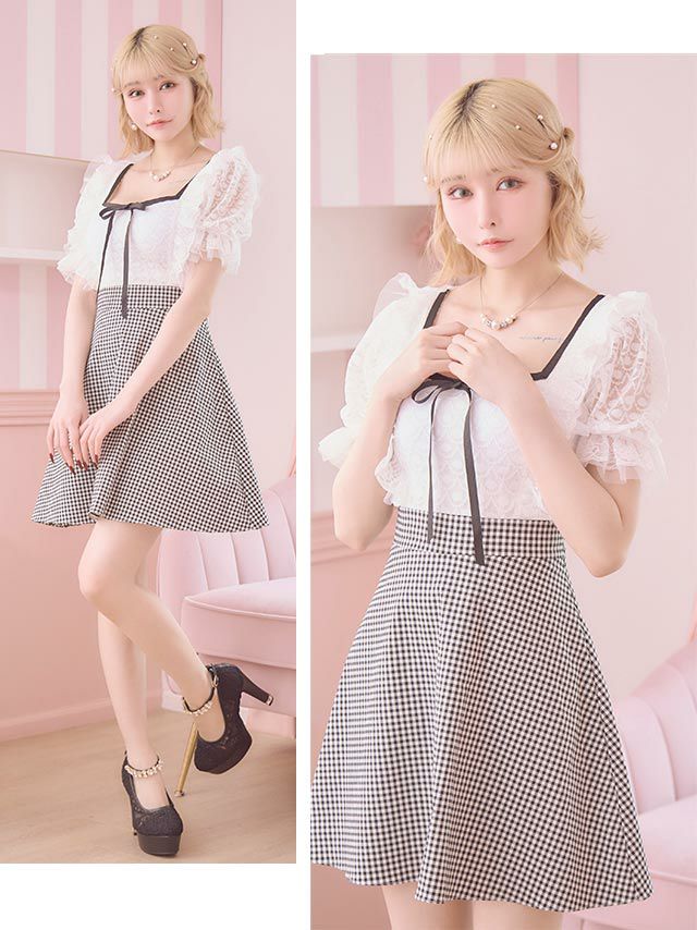 4. [韓国ドレス] パフスリーブレースチュールリボンハイウエスト切替フレアチェック柄ミニドレス (Sサイズ~Lサイズ) (戦慄かなの/キャバドレス着用)