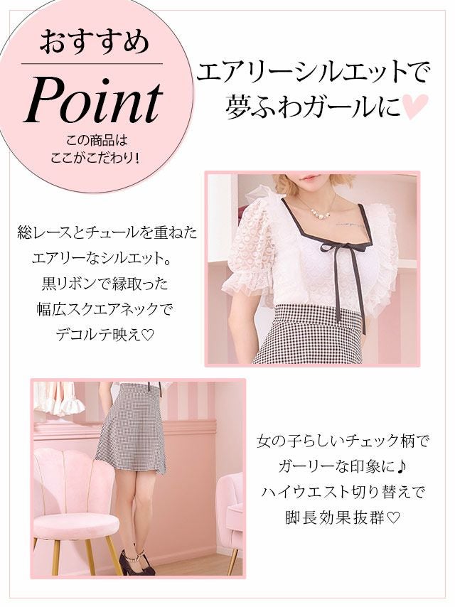 パフスリーブレースチュールリボンガーリースタイルハイウエスト切替フレアチェック柄ミニドレスの商品特徴
